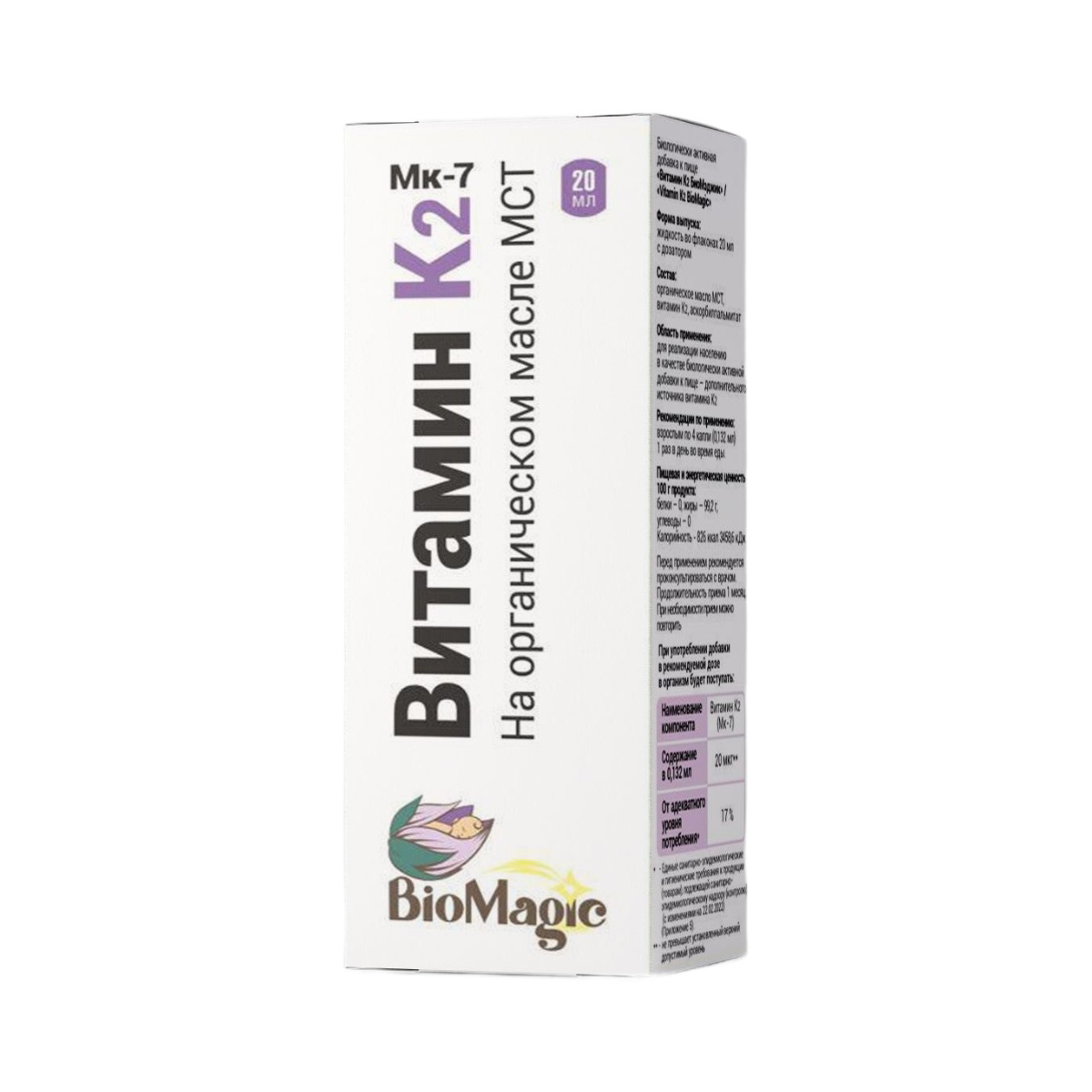 Витамин К2 (МК-7) от BioMagic необходим для синтеза белков, участвующих в свертывании крови и костном метаболизме. При дефиците витамина К2 можно столкнуться с частыми носовыми кровотечениями, обильными менструациями, возникающими при незначительных повреждениях синяками и длительным послеоперационным кровотечением. Также витамин К2 транспортирует кальций в кости и зубы, поэтому особенно важно следить за его статусом в пожилом возрасте, чтобы избежать частых переломов и уменьшить риск возникновения остеопороза. Он также может снизить кровяное давление и риск развития инсульта, оказывает влияние на окислительно-восстановительный баланс, снижая образование активных форм кислорода (АФК). Масло МСТ прекрасно повышает усвоение К2 и отлично подходит людям с чувствительным ЖКТ, так как благодаря своей средней длине цепи оно легче окисляется в процессе липолиза. BioMagic в своих формулах использует чистейшее органическое масло МСТ от компании, специализирующейся на органическом земледелии, изготовленное из чистого кокосового масла без примесей пальмоядрового.