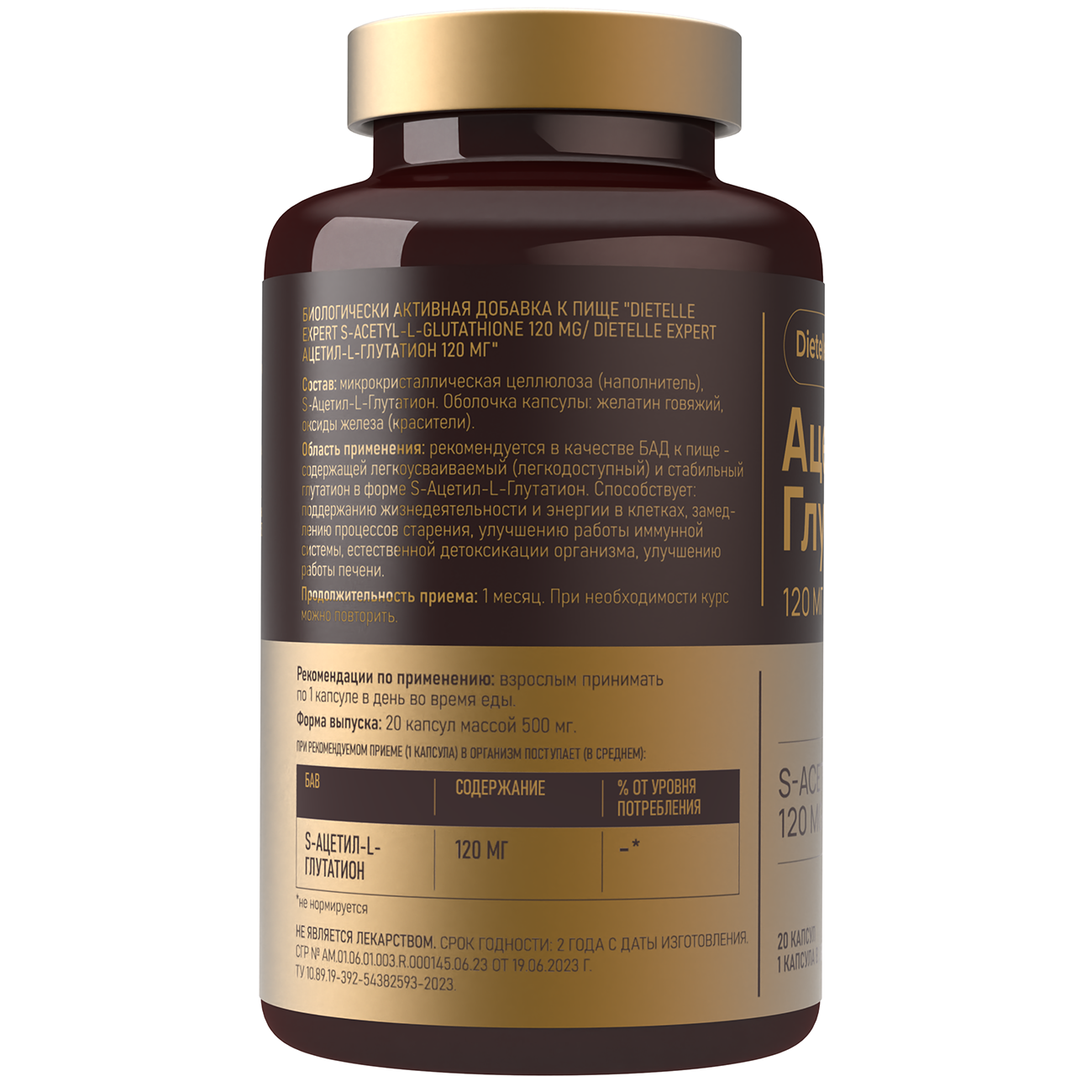 Ацетил-L-Глутатион от Dietelle - это легкоусвояемая форма глутатиона, разработанная для поддержания красоты, молодости и активности. В отличие от обычного L-глутатиона, S-Ацетил-L-Глутатион обладает повышенной биодоступностью и эффективно поддерживает общий уровень глутатиона в организме. Глутатион является мощным антиоксидантом, играющим ключевую роль в процессах детоксикации и защите клеток от повреждения свободными радикалами. С возрастом выработка глутатиона снижается, что может приводить к преждевременному старению, ослаблению иммунитета и развитию хронических заболеваний. Dietelle Expert S-ацетил-L-глутатион способствует замедлению процессов старения, поддержанию энергии в клетках, улучшению иммунной системы, естественной детоксикации организма и слаженной работе печени.
