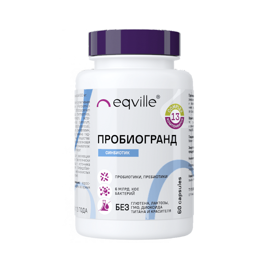 Пробиогранд от Eqville - это синбиотик из 7 видов живых бактерий с высоким титром - 6 млрд КОЕ бактерий в 2 капсулах, для восстановления микрофлоры кишечника после приема антибиотиков, лекарств, алкогольных и пищевых отравлений. Пробиогранд от Eqville произведен с помощью запатентованной технологии микрокапсулирования живых организмов и не требует хранения в холодильнике. Специально подобранные штаммы лакто-, бифидо-, пропионовокислых бактерий колонизируют кишечник и проявляют антагонистическую активность к патогенным микроорганизмам, активизируют рост и размножение симбиотический микрофлоры, нормализуют микробный баланс в кишечнике.