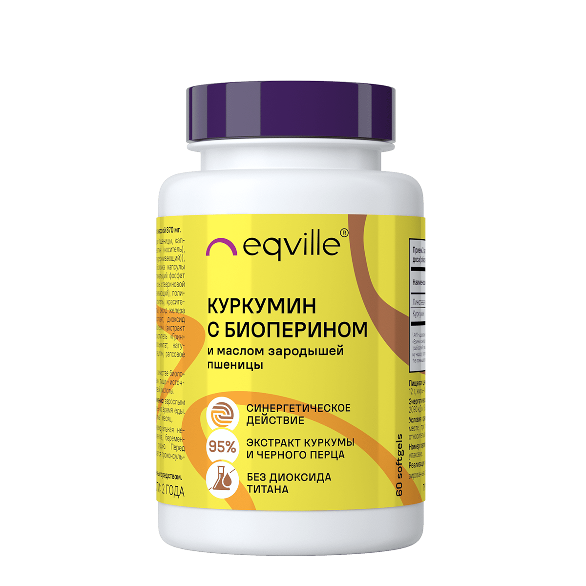 Куркумин с биоперином и маслом зародышей пшеницы от Eqville - это биодоступный 95% экстракт куркумы с экстрактом черного перца (BioPerine) в форме Softgel. Исследования показали, что экстракт черного перца BioPerine помогает улучшить усвоение куркумина в кишечнике и печени в 20 раз. Выделенное активное вещество куркумин, является природным антибиотиком, которое обладает противовоспалительным действием на организм, повышает иммунитет, борется с бактериями и вирусами, является натуральным антиоксидантом, поэтому активно используется как Anti-age средство.