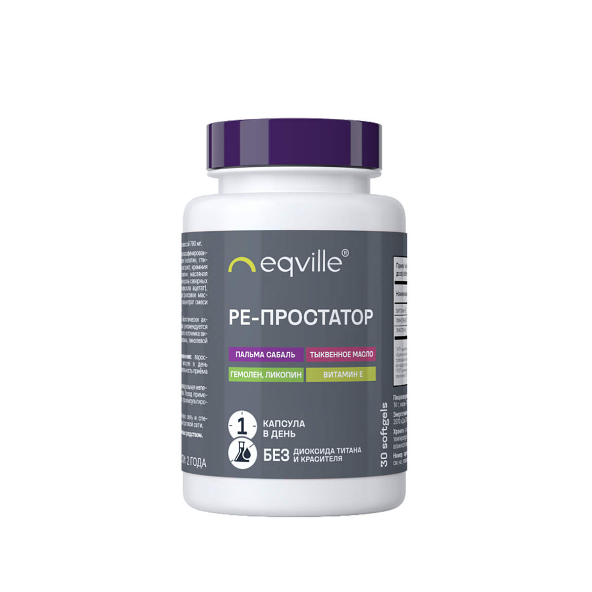 Ре-простатор от Eqville - это комбинированный комплекс для мужского здоровья, содержащий натуральные компоненты, такие как экстракт пальмы сабаль, гемолен, тыквенное масло, ликопин и витамин Е. Активные компоненты пальмы сабаль нормализуют соотношение половых гормонов, стимулируют выработку тестостерона и улучшают функцию предстательной железы, уделяя особое внимание здоровью мочевыделительной системы.