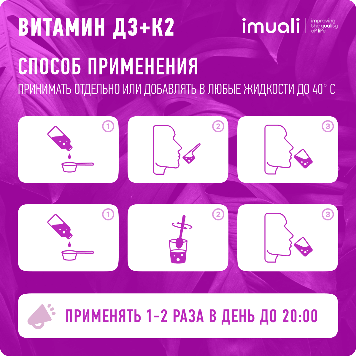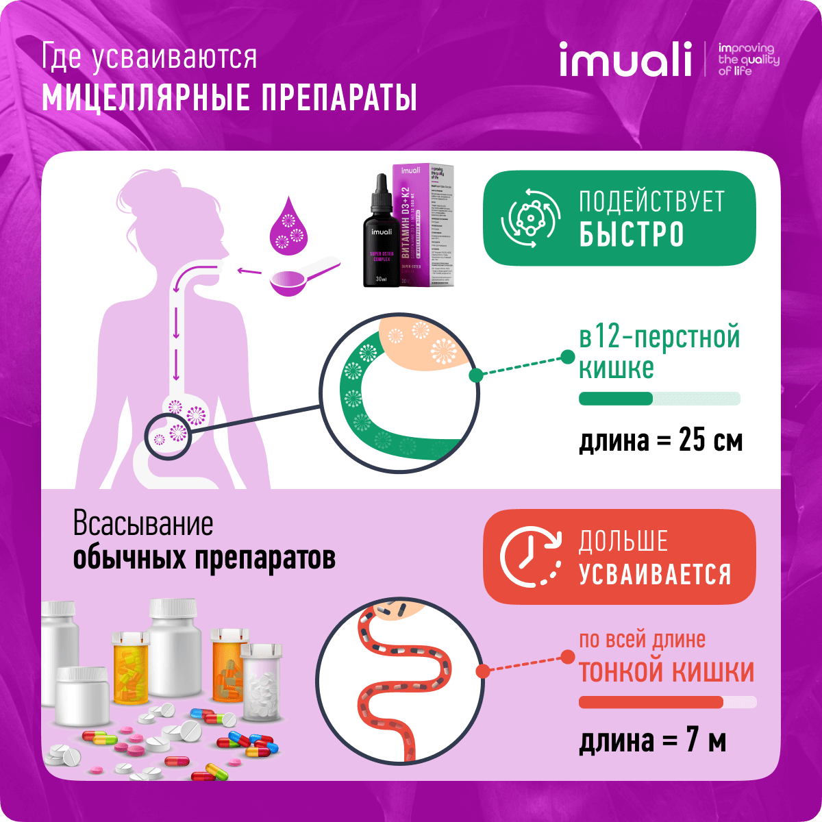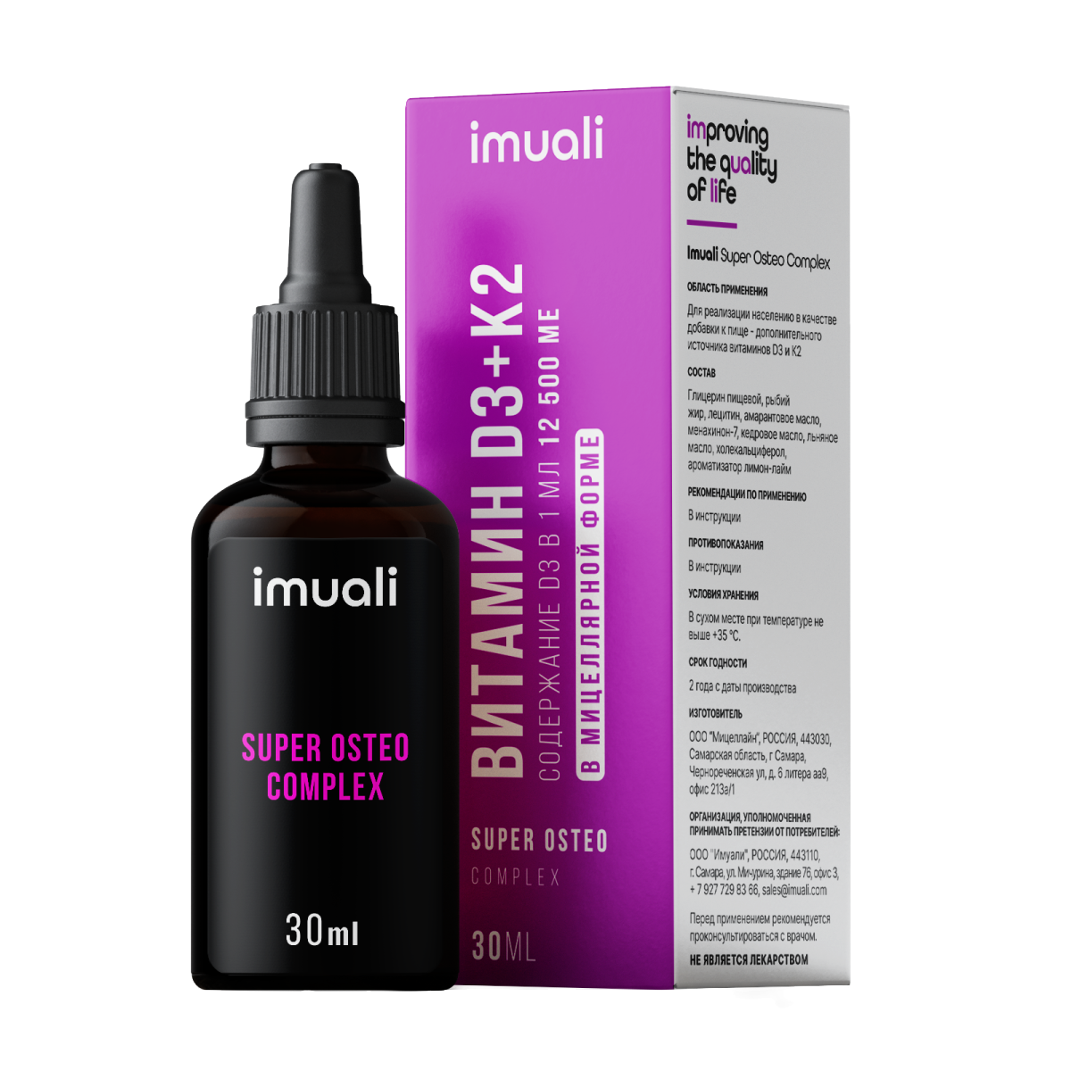 Мицеллярный комплекс «Super Osteo Complex» от IMUALI — Мицеллярный комплекс витаминов D3+K2 для устранения острого дефицита витамина D3. В составе препарата содержится сбалансированное количество витамина К2. Это ВАЖНО, потому что Витамины D3 и К2 способствуют правильному усвоению кальция, который необходим для поддержания прочности костей. Благодаря витамину К2 кальций направляется непосредственно в костную ткань, а не откладывается на стенках сосудов, в суставах и почках. Витамин D3 регулирует активность остеобластов и остеокластов, поддерживая здоровую структуру костей и предотвращая их деформации и ослабление, а также укрепляет зубную эмаль. Он также активирует рецепторы, контролирующие всасывание и отложение кальция и фосфора, и стимулирует процессы регенерации клеток эпидермиса, улучшая кровоснабжение и синтез тканей, разглаживая морщины и улучшая рост волос и ногтей.