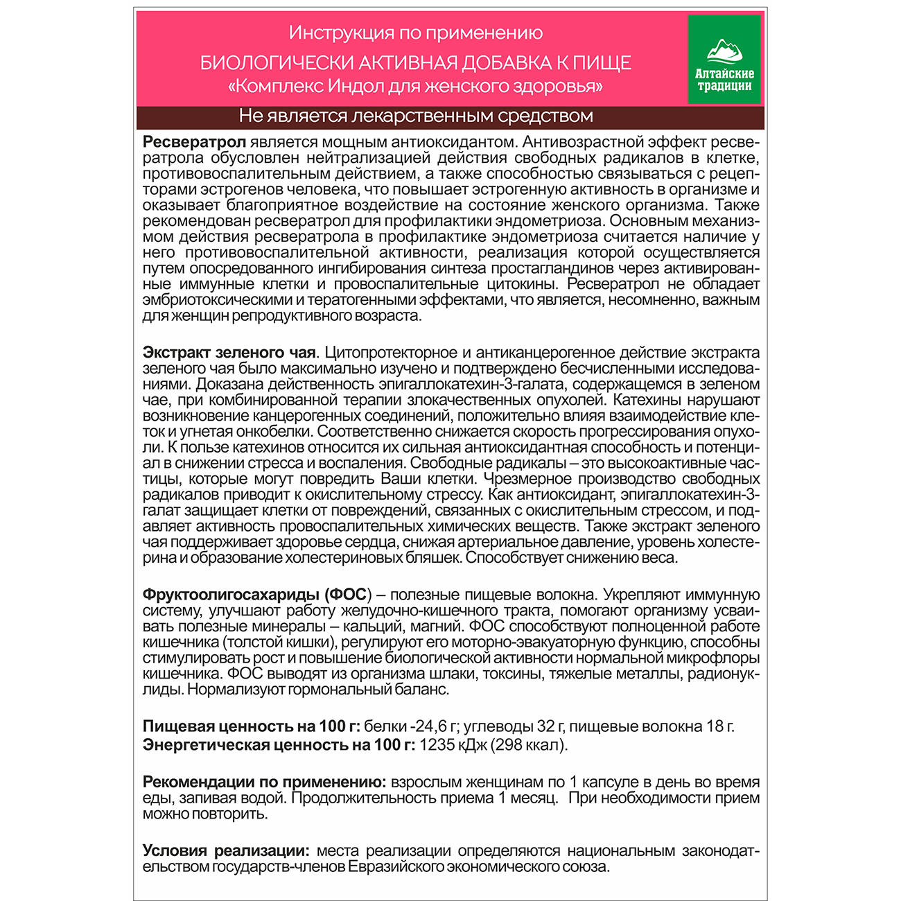 Комплекс «Индол для женского здоровья» от Простые решения предназначен для профилактики заболеваний молочных желез, обеспечивая защиту организма на клеточном уровне от вредных веществ. Индол-3-карбинол, входящий в состав, тормозит образование "плохих" метаболитов эстрогенов, снижая деление клеток эстрогензависимых органов и угнетая рост сосудов в образованиях. Ресвератрол рекомендован для профилактики эндометриоза и оказывает противовоспалительное действие, а эпигаллокатехин-3-галат защищает клетки от окислительного стресса. Сочетание этих компонентов способствует поддержанию женского здоровья и профилактике различных заболеваний.