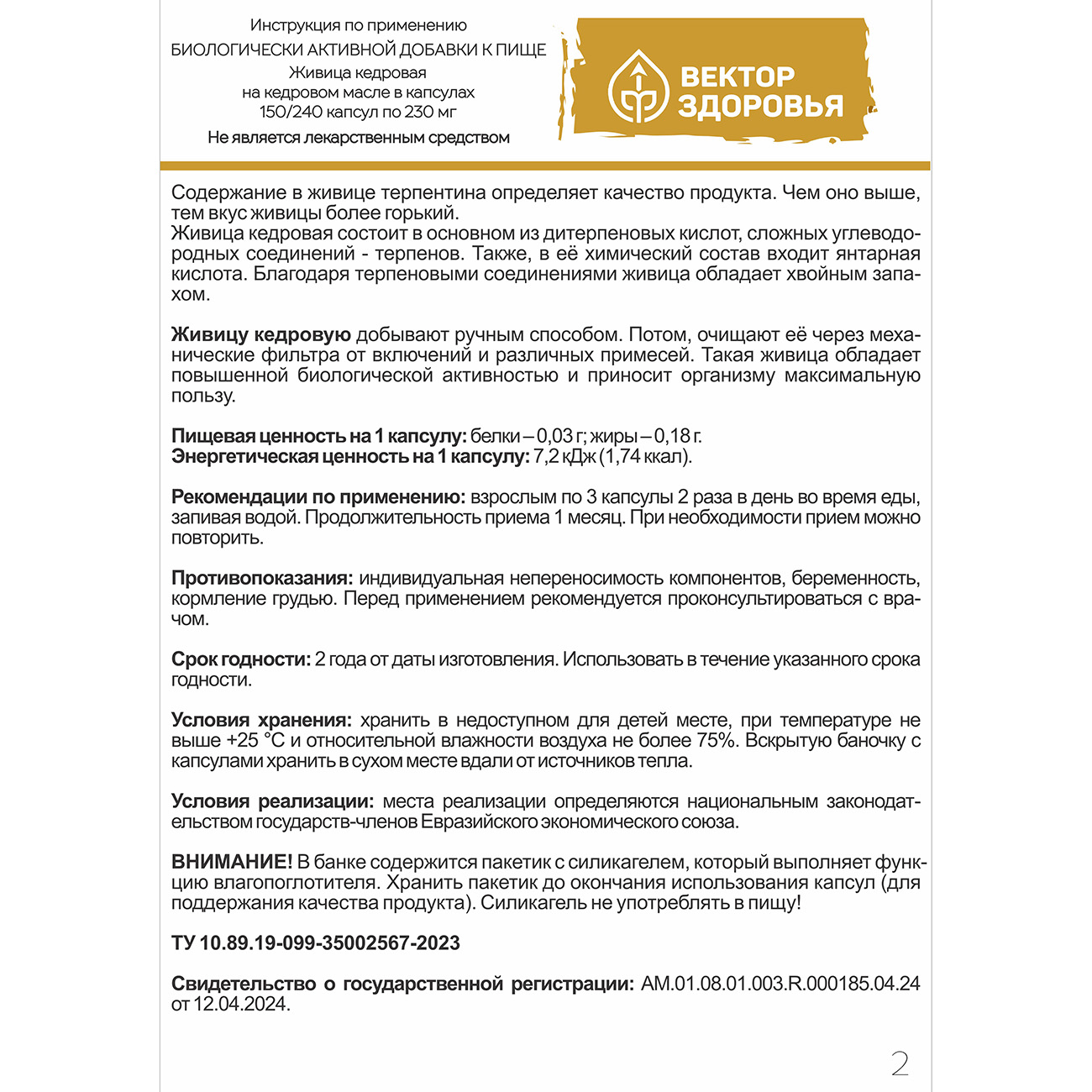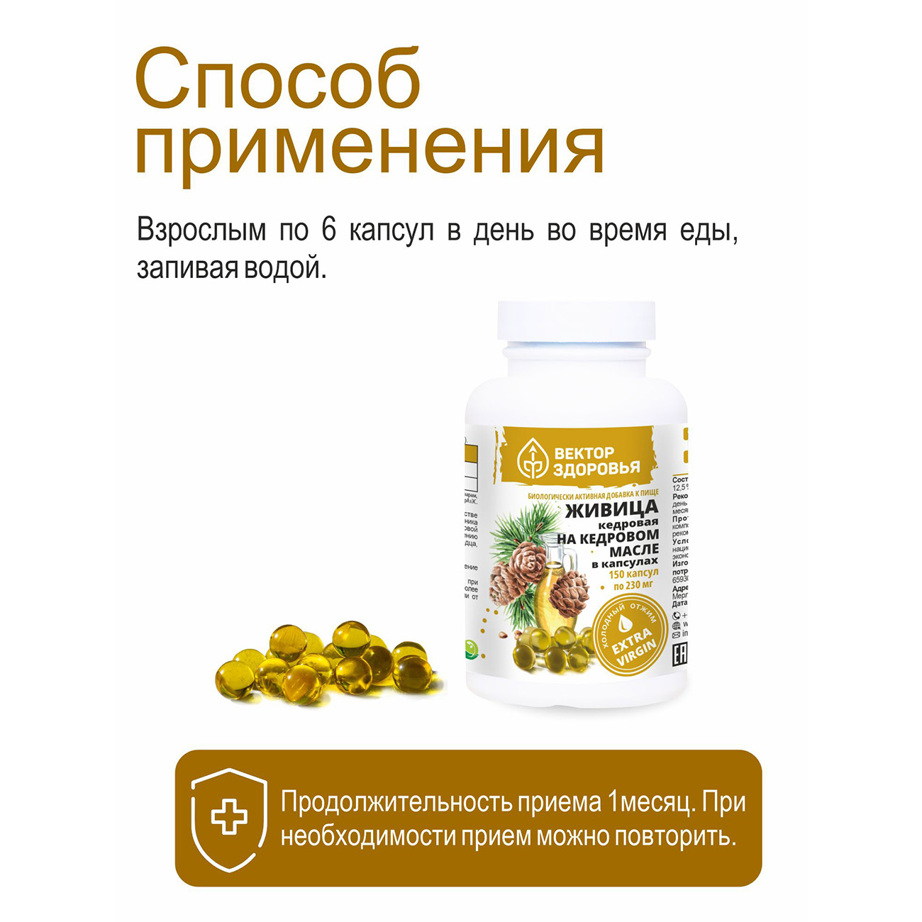 Живица кедровая 12,5% на кедровом масле добывается ручным способом. После добычи живица проходит очистку через механические фильтры, чтобы удалить включения и примеси, сохраняя при этом повышенную биологическую активность. Масло кедрового ореха отжимается на гидравлическом прессе, что позволяет избежать термической и химической обработки, сохраняя все полезные свойства. Полученный комплекс объединяет силу двух компонентов. Живица, благодаря терпеновым соединениям, обладает антибактериальными, антисептическими, обезболивающими, ранозаживляющими и противовоспалительными свойствами. Кедровое масло богато витамином Е, благодаря чему обладает иммуномодулирующим и антиоксидантным эффектом, помогает замедлить процессы старения.
